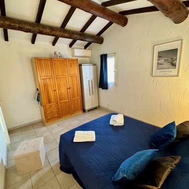 Une chambre climatisée à l’étage avec un lit de 140x190 et armoire de rangement